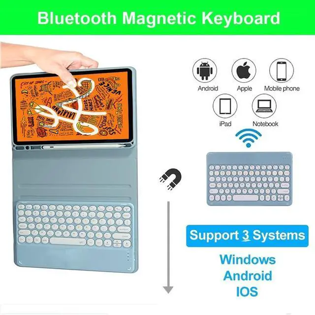 Product Features: 1. Magnetic removeable keyboard2. Converts from to stand3. Stylish PU leather Covering/ case4. With front and rear-facing canera holesHow to connect the Bluetooth keyboard? 1. Open the case, and insert the tablet into the case. 2. Dial ON/OFF button on right direction for opening keyboard, press FN+C into wireless matching condition. (The Bluetooth light blinks slowly) 3. Open bluetooth on device, search keyboard name(Bluetooth Keyboard 3.0 ) for matching device to keyboard4. Click the "Bluetooth Keyboard 3.0" to connect, finish.