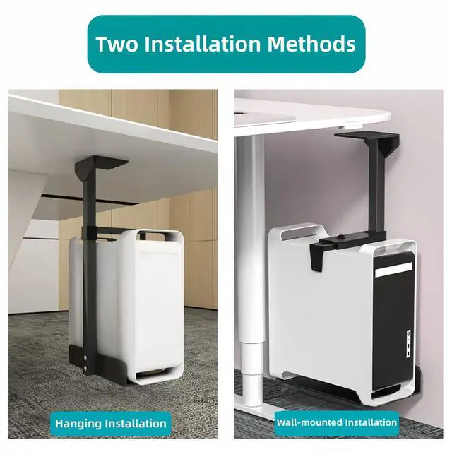 Under the Desk or On the Wall Mount PC Cases HolderInstall your computer case under the table or on the wall beside the table. This way, you can enjoy a more comfortable legroom and keep the area under your table looking neat and tidy. The stand suspends your PC cases under the table, protecting it from kicks or bumps and also enhancing the cooling speed. ^^ Adjustable Bracket Compatible with Most Computer CasesThe width adjustment range is 5.1 "- 8.4" (13cm- 21.5 cm), and the height adjustment range is 4.5 "- 18.5" ( 11.5 cm-47cm).