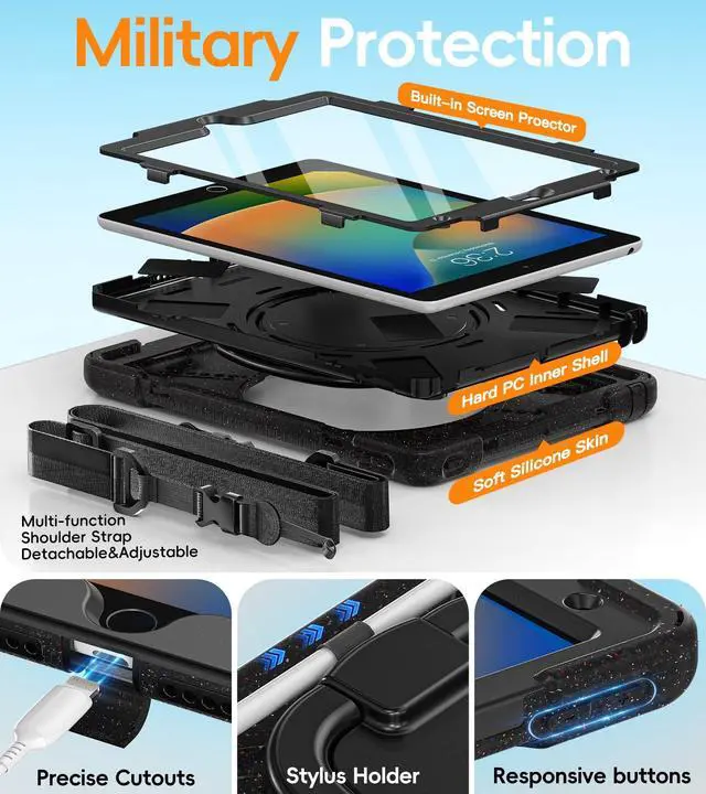 Layer Protection: Three layer structure design with built-in transparent screen protector, providing full body protection prevent from drops, shocks, bumps, scratches and dirt; Don't worry about your iPad slipping out of your child's hand and getting damaged; Full access to all ports, buttons and cameras without removing the case.