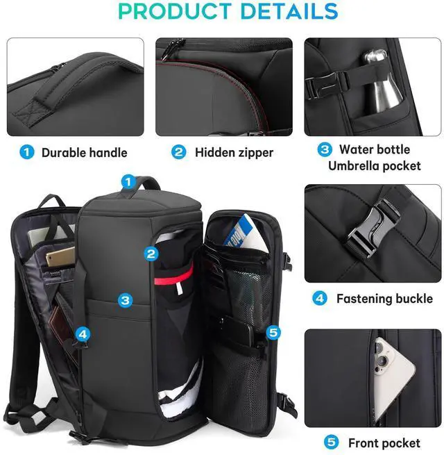 Capacity Backpack: The dimension is 19.5 * 13.2 *8inch, the capacity is around 40L, it is perfect for traveling. It has three spacious main compartments. Main compartment can hold 3-5 days clothes for business traveling or weekener holiday. The separated laptop compartment can hold 17inch notebook. Front pocket is convenient for storing and retrieving frequently used small items. ^^ Flight Approved BackpackBANGE backpack is within the maximum limit for IATA flights carry-on luggage. 180 opening design for the main comparment and the laptop comparment, it can help you pass the air security quickly, and it can be stowed under the seat as a personal item in flight. ^^ Day Pack Backpack with Water Bottle HolderThere is two side pocket to hold your water bottle or umbrella. The adjustable side buckle can tighten your items in the main comparment and bottle. ^^