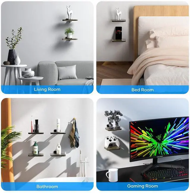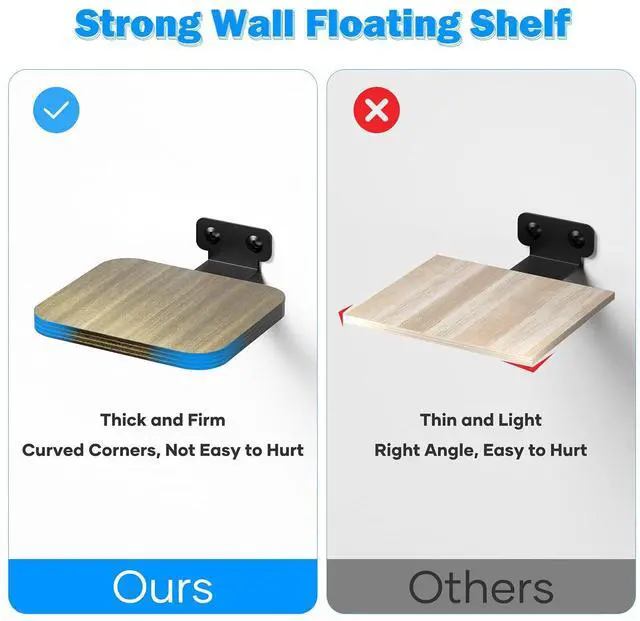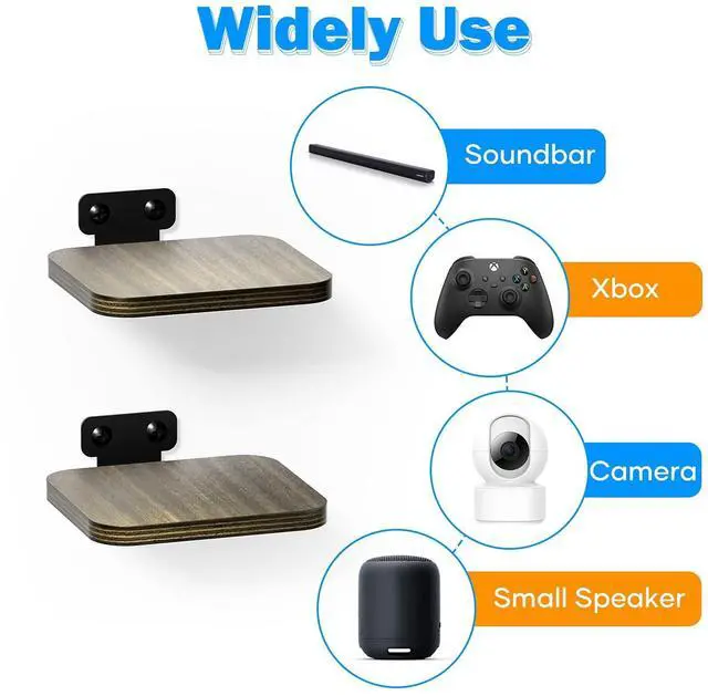 Features: 1. Place your speaker, soundbar, webcam, cell phone, mesh router, DVD players, cable boxes, games consoles, HI-FI or TV accessories on it without any worries. 2. You can install it everywhere you want, such as the living room, bedroom, office, kitchen, etc. 3. Floating shelves are made of wood, which is damp-proof and Eco-friendly. The four corners of the board are processed to protect children from bumps. 4. Wall mounted shelves are composed of durable wood and metal bracket, which can place your object with safety. 5. The size is 5.9 * 5.2 * 0.5 inch and the thickness is 1.2 cm6. Help you save desktop space and make the rooms neater, also can be a beautiful home decoration and make your life more comfortable. 7. Comes with install instruction and all hardware kit. You can install the wall mount shelf without any hassle.