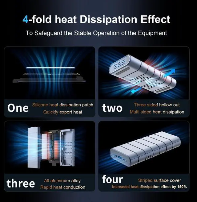 ^^ Aluminum HousingThick aluminum alloy body with fan, unique CNC processing technology,. The all-aluminum body has good heat dissipation performance, which helps to reduce the internal temperature and maintain the best performance of the SSD. ^^ Compact and PortableIt can be easily carried in a pocket, laptop bag, or briefcase for easy use at any time