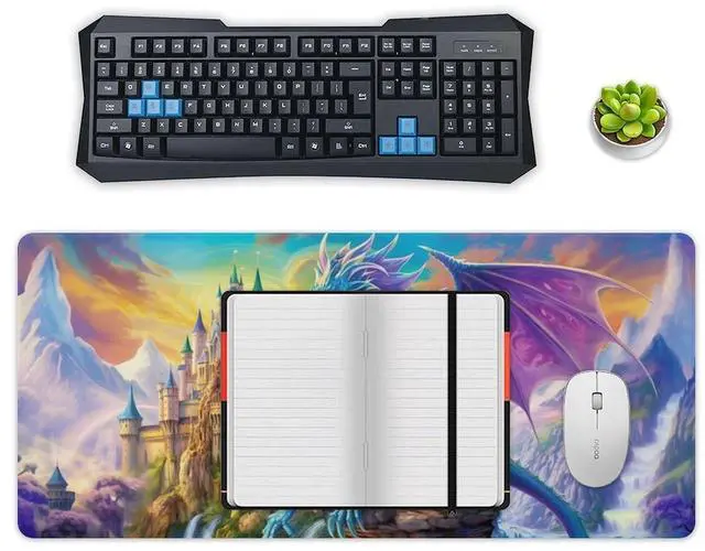 [HD PRINTING] These well-designed dragon mouse pads are printed using advanced HD printing technology, ensuring that they are fade-resistant and wrinkle-free. This provides you with a vibrant, high-quality extended mouse pad that leaves a lasting impression. ^^ [STITCHED EDGES] The castle dragon desk mat features a locked edge design to prevent the edges from curling. This not only extends the life of the pad, but also ensures that the desktop surface is stable and flat, maintaining a professional workspace. ^^ [NON-SLIP RUBBER BASE] The blue dragon desk pad is made of thick textured rubber, is durable and can firmly grip the desktop, effectively preventing sliding and unwanted movement.