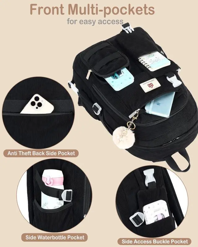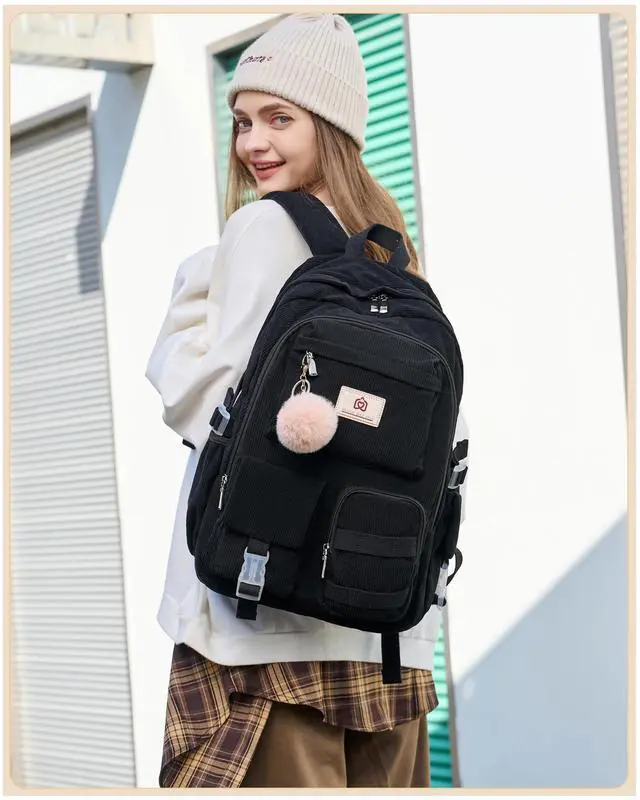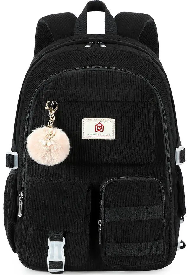 Hidds School Backpack for Teens Girls Women 15.6 Inch Laptop College Backpacks Corduroy Kids Bookbag Students Travel Daypack Womens (Black)