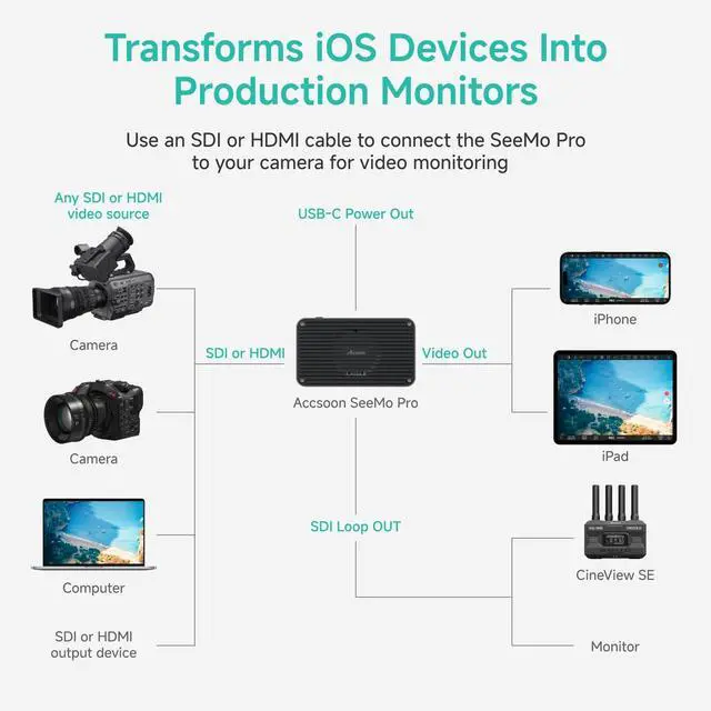Accsoon Ecosystem: SeeMo Pro can also be used with Accsoon iPad PowerCage to use as a monitor. It is also compatible with Cineview SDI dual-band wireless transmitter like Accsoon CineView SE/Quad which transmit the video up to 4 devices ^^