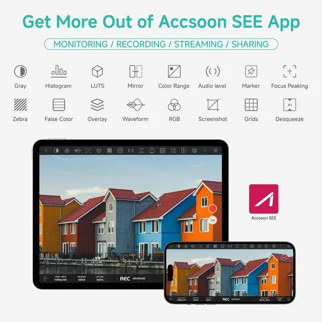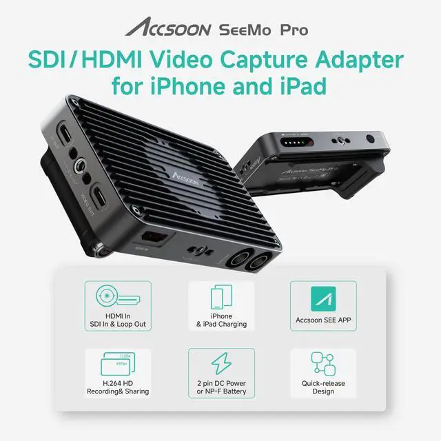 Powerful SeeMo Adapter: Accsoon SeeMo Pro is designed for turning the iOS devices into a monitor, connecting via Lightning or USB-C to transmit HDMI video directly to your iPhone and iPad. With Accsoon SEE App, iOS devices own excellent screen quality and powerful video processing capabilities ^^ Professional Outdoors Monitoring and