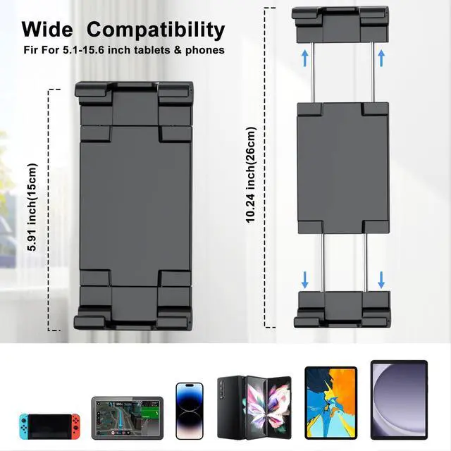 All Your Gear: This universal handlebar iPad mountthink Peloton iPad holder or tablet holder for treadmillplays nice with any phone or tablet from 5.1" to 15.6". Its ready for iPhone 16, 15, or 14, Moto X, iPad Pro ( 12.9", 11", 10.5", 9.7" ), iPad Air ( 10.9", 10.5", 9.7" ), or iPad Mini (2 through 6) in an iPad holder. Its perfect for Galaxy Tab S9, S8, S7, A, E, or S24 series, Fire HD, Surface Pro, or Gowhatever youre using, this treadmill iPad holder holds it steady. ^^ 4. Keeps Your Tablet Safe and