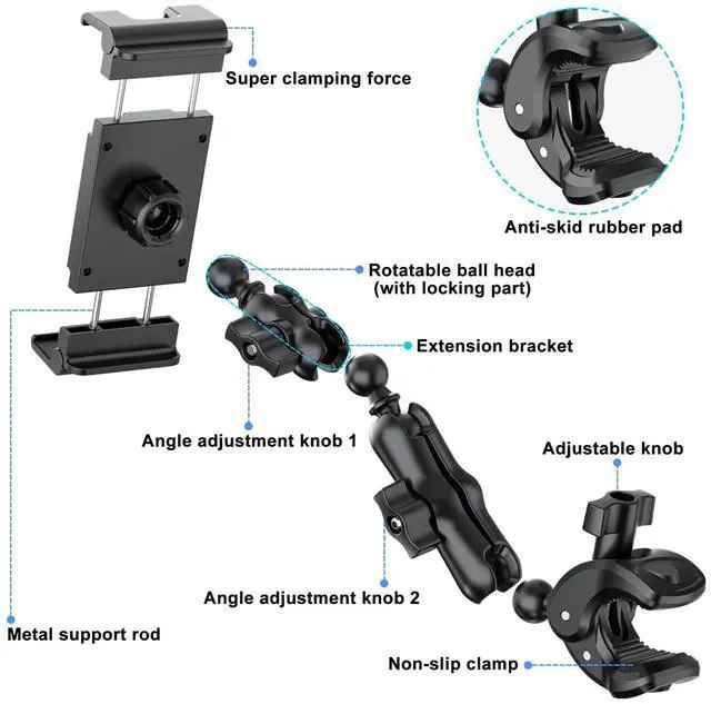 Angle It However You Want: This iPad clamp mount comes with four ball joints that spin 360 degrees, so you can tweak it any way you like. Just turn one knob to loosen or lock, and bamyouve got the perfect angle with no blind spots in a flash. Setting up this treadmill tablet mount or phone holder for Peloton bike? Easy as pie, no sweat. ^^ 3. Works with