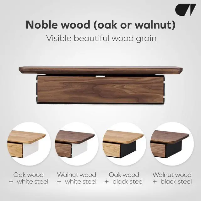 ^^ High-quality materials: The shelf is available in two versions: solid walnut wood in a chocolate tone with visible grains or oak, which is characterized by its light tone and clear structure. The powder-coated steel is resistant to corrosion and damage and combines durability with modern style.