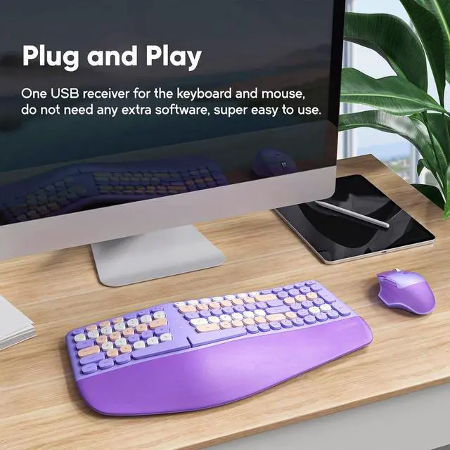 MEMBRANE ERGONOMIC KEYBOARDSplit and sloping keyboard design matches your arms and hands. The low keys can be activated with a light press, reducing typing stress. The integrated wrist rest supports your wrist in a comfortable position. This carpal tunnel keyboard allows you to type in a more natural posture, reducing muscle strain in your wrists and forearms. ^^ WIRELESS CONNECTION 2.4G wireless transmission technology, the maximum transmission distance can reach 10m. The wireless connection solves the desktop clutter problem caused by the data cable, suitable for those who like to have a neat desktop.