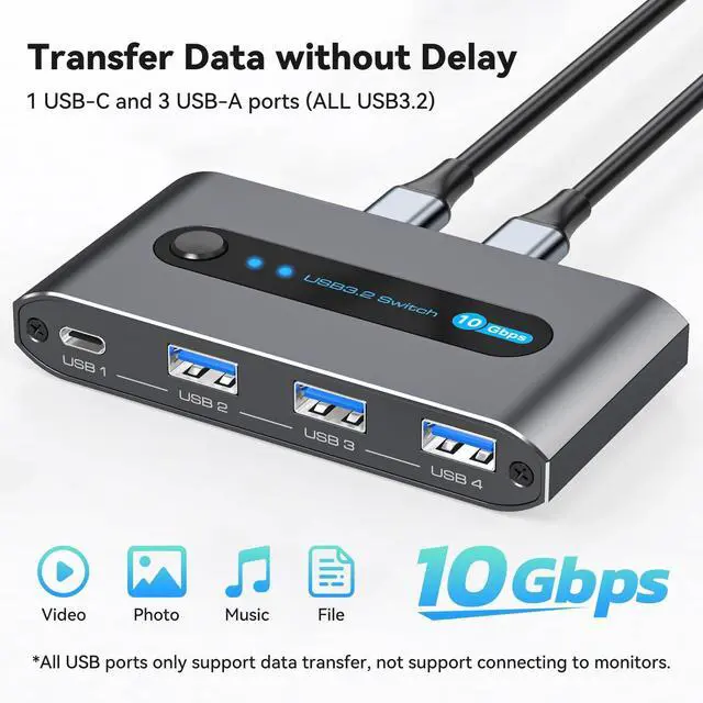 Note: Not a KVM switch, does not support monitors. PD charging is not supported, Not supporting power supply for other devices ^^ 10Gbps Data Transfer USB 3.2 Switch supports up to 10Gbps data transfer and is backward compatible with USB 2.0 and USB 3.0.