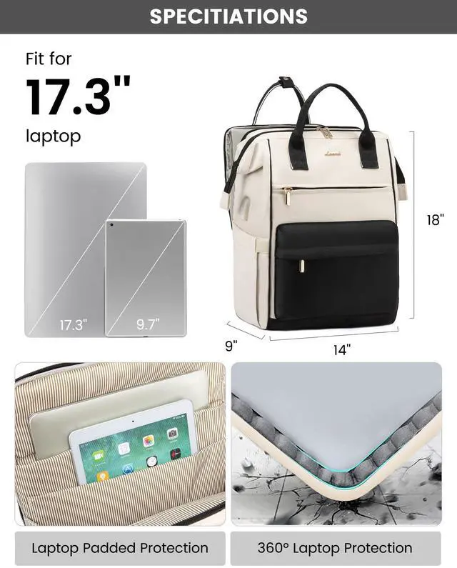 LAPTOP PROTECTIONDesigned with dedicated compartments for a 17-inch laptop and a 12.9-inch iPad, this women's work backpack features cushioned pockets, offering superior protection for your electronics.