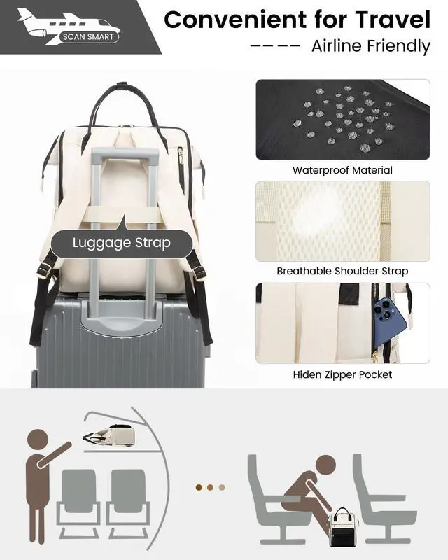 TRAVEL-FRIENDLY BACKPACKThis travel backpack for women includes a trolley strap for seamless attachment to rolling luggage, simplifying travel. It also boasts a secure anti-theft pocket, safeguarding your valuables from theft.