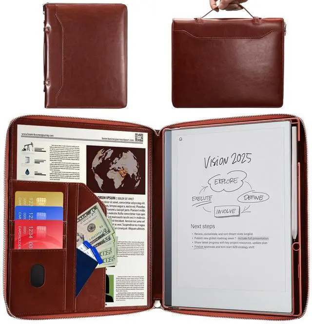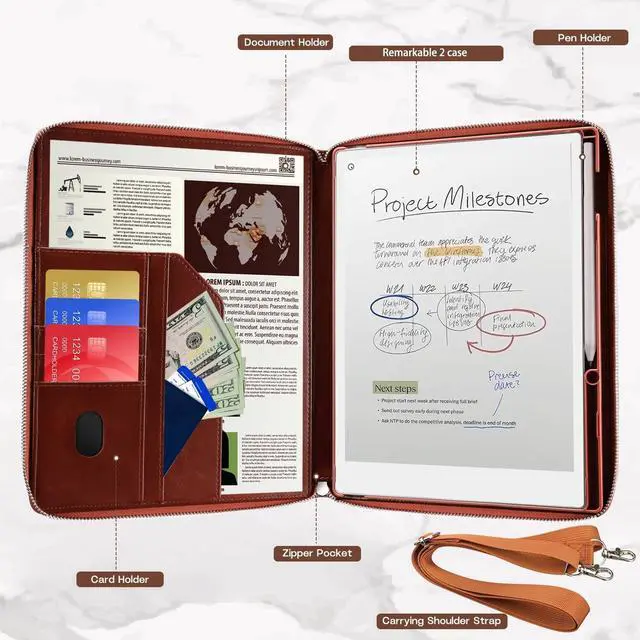 Note: It will NOT work for reMarkable 1/3 or other device. Please kindly check the model number before purchase. ^^ UNIQUE ZIPPER DESIGNOur remarkable 2 cover is very suitable for all business elite. With the zipper pocket, you don't need to worry about the tablet falling out. The zippered folio is handmade by experienced craftsmen. Elegant never goes out of style handmade charm. ^^ HANDHELD-BRIEFCASE DESIGNLet your remarkable 2 case become a portable briefcase, protect your tablet from receiving damage, durable and extremely sturdy. And with the carrying shoulder strap, you could carry your remarkable 2 conveniently when you are at work or outdoors. ^^ BUILT-IN PEN HOLDER & CARD SLOTSRemarkable 2 cover makes it easy to pull out and store your pencil, avoid falling out while walking. The Case's surface and inside store your cards, sticky notes and other paper. ^^ DESIGNED FOR FULL PROTECTIONMade by superior quality of PU leather effectively protect your remarkable 2 digital paper tablet from any unwanted scratches, scuffs, and any other hard objects. PLZ trust our vast experience, the folio has been carefully handcrafted and meticulously designed to meet the industrys highest standards.