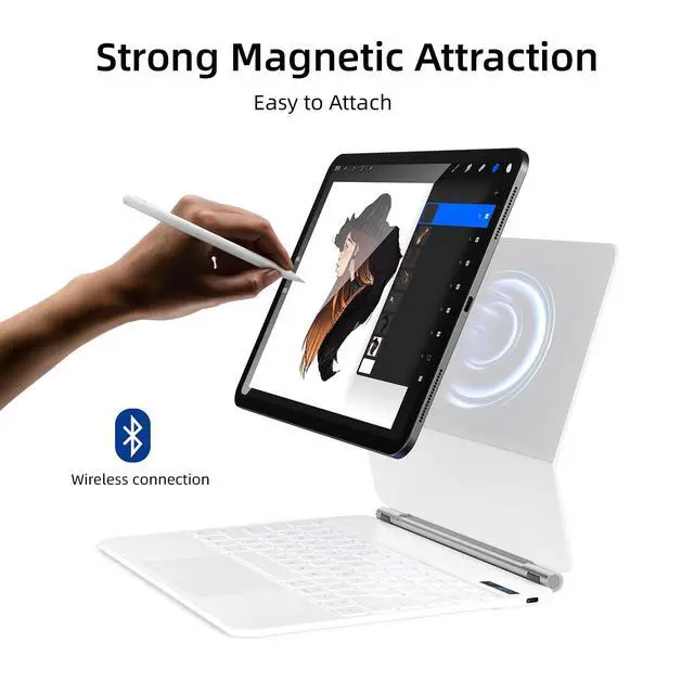 Perform your tasks with a single press, making your work process faster and more efficient, allowing you to work smarter, not harder ^^ Secure Magnetic Attachment for Stability and FlexibilityEnjoy maximum stability with a strong magnetic design that attaches your keyboard in seconds. Adjust the angle for comfort and convenience, whether youre typing, viewing, or working from any locationstability and flexibility in one ^^ Vibrant, Customizable Backlight for a Premium ExperienceTransform your workspace with a dazzling backlight! Choose from 7 vibrant colors and 3 adjustable brightness levels to perfectly match your environment.