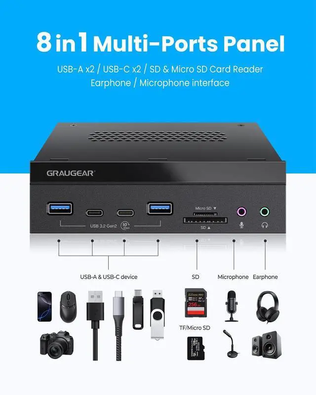Multiple safety protection measures such as over-current protection, over-voltage protection and short circuit protection (Note: SATA power for card reader requirement) ^^ Package ContentsGRAUGEAR 5.25 front panel usb hub with internal card reader, screws, USB 3.2 Type-E Key-A 20-Pin Header and USB 3.0 19-Pin cables, instruction manual and friendly customer service