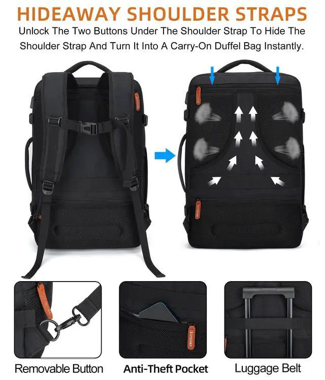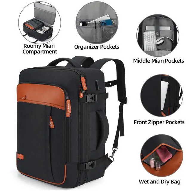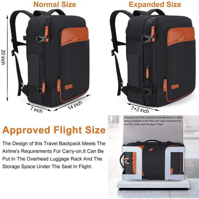 LARGE CAPACITY & EXPANDABLEThis extra large travel backpack with expandable feature offers you more packing capacity up to 42L. One separate laptop compartment hold 17 Inch Laptop as well as laptop accessories, textbooks. One spacious packing compartment roomy for daily necessities, clothes. Front zipper pocketx2, side pocket for water bottle or umbrella, back anti-theft zipper bag which can store valuables such as mobile phone or cards. These small designs keep your items neat and easier to find ^^ FLIGHT APPROVED CARRY ON BACKPACKThis versatile travel backpack meets the carry on requirements of most airlines, so you can put it under your seat or overhead bin to save extra money.