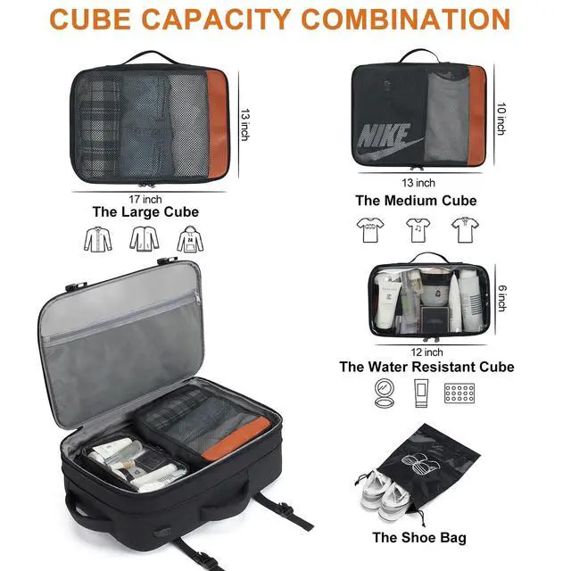 180 degree zipper closure helps you pass through the security check quickly. Perfect as an everyday backpack, laptop backpack and casual backpack for weekend getaway trips. Travel gifts for both men and women ^^ EXTRA 3 PACKING CUBES+1 SHOE POCKETThis weekend travel backpack comes with three packing cubes. large cube and medium cube for clothes, personal item. Small water resistant cube with transparent side for providing clear overview of Toiletries. there's also a shoe pocket. Keeping your belongings neater and more organized. Serve you well as carry on bags for airplanes, weekender backpack, personal item travel bag, overnight bag ^^ HUMANIZED DESIGNThe travel bag is made of high-quality water-resistant fabric, durable, anti-wrinkle, wear-resistant, and with sturdy metal zippers.