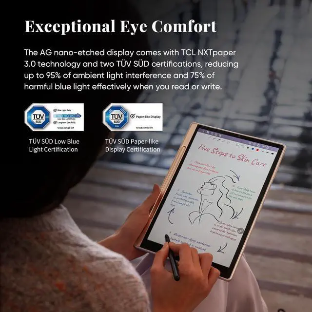 AG Nano-Etched Display: This 10.95 -inch tablet features an AG nano-etched LCD screen equipped with TCL NXTpaper 3.0 technology, which reduces up to 95% of ambient light interference and delivers a Immersive visual experience.