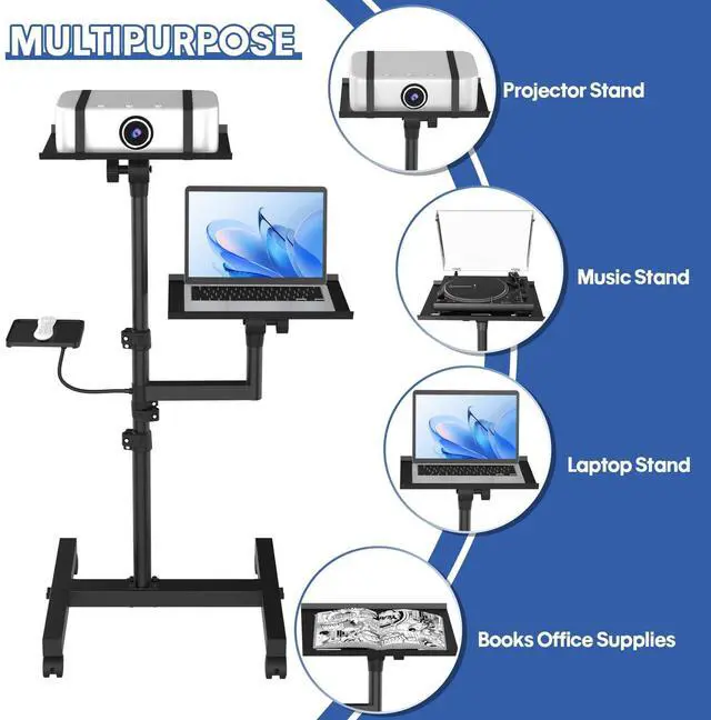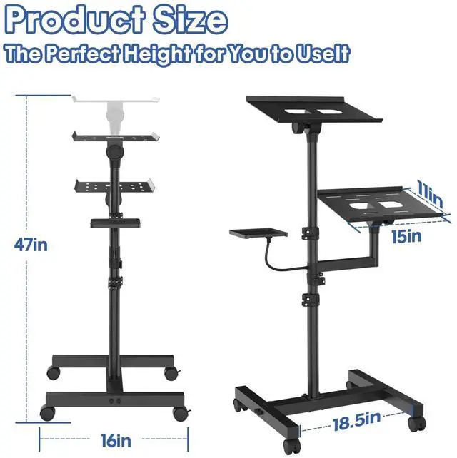 Mobile Laptop Stand: The laptop tripod is made of a sturdy and durable aluminum alloy materials. Equipped with two adjustable trays with four high quality silent casters that can swivel freely. 2 casters can be locked to increase the utility and safety of this product ^^ Adjustable Height & AngleGSOW projector mount Easily adjust the height up to 47inch with the top tray able to conveniently tilt up to 30, Unique adjustable snap design makes it easier for you to adjust the right height, which is essential for you whether you use it for office or home entertainment ^^ Sturdy Construction for DurabilityThe bottom of our rolling computer floor stand is constructed with a reinforced H-beam steel frame with four support points on the ground, which provides superior stability compared to others projector stand tripod with three support bars, ensuring that your equipment is fully supported. ^^ Multifunctional Projector StandDiscover the ease of multitasking with the projector stand's 2-tray innovative design, catering to your laptop and projector, plus a Mouse or any combination of equipment and devices. Perfect for home, stage, meeting, parties, or indoors. ^^ Order with