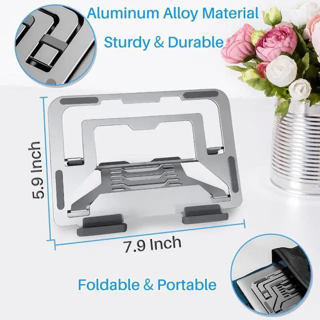 Value Combination1 x foldable laptop riser + 1 x phone holder. ^^ AdjustableThe ventilated laptop stand with 6 adjustable angles and ergonomic design allows it to be raised to your comfortable height, which can alleviate back/shoulder/neck/arm pain and enhance working experience. ^^ Heat DissipationThe hollow design of the anti slip laptop stand provides good ventilation, helps laptop to dissipate as well as improves your laptop's cooling performance. ^^ PortableThe ventilated laptop holder is foldable and lightweight to carry around, you can put it in your bags when you go out without occupying too much space.