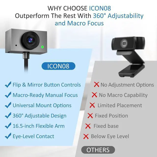 1080P WEBCAM - This webcam for pc supports 1080P resolution and features Manual focus, delivering crisp, vivid images and smooth video to capture every detail. It's the perfect choice for home offices ^^ FLEXIBLE SUPPORTING FRAME - This webcam for laptop features a freely adjustable gooseneck stand (40 cm) for effortless angle positioning. A physical sliding privacy cover effectively protects the lens, while the USB cable measures 150 cm and comes with a dedicated desktop clamp ^^ NOISE-CANCELING MICROPHONE - This streaming camera features an advanced noise-canceling microphone that filters out ambient noise, ensuring your voice remains clear and loud even in noisy environments ^^ PLUG AND PLAY - This pc camera for pc desktop supports USB 2.0 / 3.0 interfaces and requires no additional drivers.