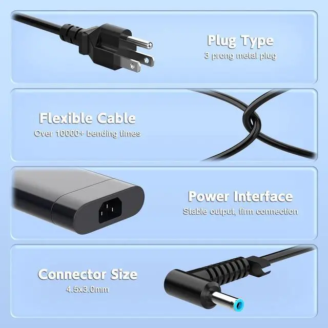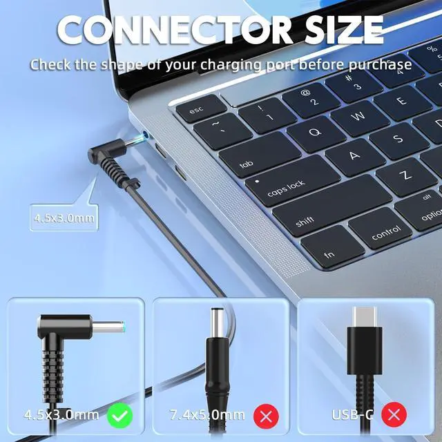 Connector Size: 4.5 * 3.0 mm blue tip (NOT fit 7.4 * 5.0 mm) ^^ Compatible with Victus Gaming Laptop 16.1 15.6 inch 16-e0000, 16-e1000, 16-e0xxx, 16-e1xxx, 16z-e000, 16z-e100, 16z-e0xx, 16z-e1xx, 16-d0000, 16-d1000, 16-d0xxx, 16-d1xxx, 16-s0000, 16-s1000, 16-s0xxx, 16-s1xxx, 16-r0000, 16-r1000, 16-r0xxx, 16-r1xxx, 16t-d000, 16t-d100, 16t-dxx, 16t-d1xx; 15-fa0000, 15-fa1000, 15-fa0xxx, 15-fa1xxx, 15t-fa000, 15t-fa100, 15t-fa0xx, 15t-fa1xx, 15-fb0000, 15-fb1000, 15-fb2000, 15-fb0xxx, 15-fb1xxx, 15-fb2xxx charger ^^ Compatible with