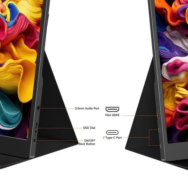 Vivid FHD IPS Display: 100% sRGB + Eye-Safe TechImmerse in stunning clarity with a 15.6" 1080P IPS panel, 100% sRGB gamut, and HDR support. Matte anti-glare coating eliminates reflections, while flicker-free & low-blue-light tech reduces eye strain perfect for all-day work (design/coding) or entertainment (movies/gaming) ^^ Multi Modes to Supercharge ProductivityExtend, duplicate, or use vertical mode for reading/coding; 170 ultra-wide viewing angles shine in presentations. This portable laptop extended monitor seamlessly switches between work and play, boosting efficiency for remote workers, students, and content creators ^^ Ultra-Thin & Light + All-in-One Smart CoverWeighing just 1.2 lbs and 0.28 thin, it slips into any bag effortlessly. The magnetic smart cover doubles as a multi-angle stand and full-screen protector ideal for on-the-go use, from coffee shops to travel ^^ VESA Mountable + Rich Extras + Premium Support75x75mm VESA holes for customized workspace setups; dual built-in speakers (1W*2, 8) + 3.5 mm audio jack for immersive sound. Package includes Mini HDMI/USB-C cables for instant use. Enjoy 12-Month quality guarantee + 24/7 tech support buy with confidence