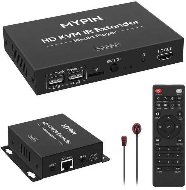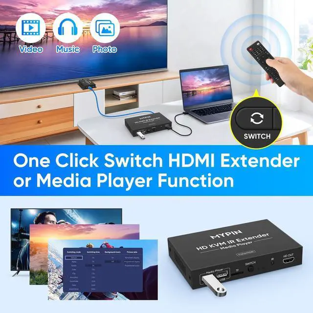 supports H. 265/HEVC decoding technology, Compared with H. 264 decoding and 1080P resolution etc. Support play music, photo, videosPPT from a USB flash drives or TF card, 2-port USB, supporting USB drive (up to 512G ) or hard drives (up to 14TB), Support Automatic video playback with endless repeat and looping, and the ability to resume from the last stopping point. Suitable for digital signage applications, partyhome theaters and office work. ^^ Support KVM USB Extend and IR Remote ControlOur HDMI USB KVM extender receiver with 2 USB 2.0 ports, which can allow you to control a computer system through keyboard and mouse.