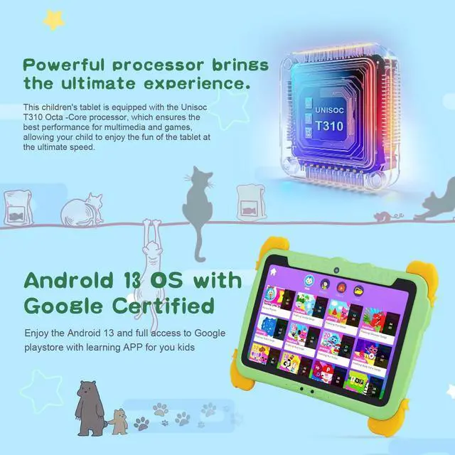 10.1 -inch Full-Fit Technology with Eyes ProtectionThe C idea Kids tablet has a 10.1 inch large touch screen, providing you with enough screen space. There is also a stunning full HD widescreen, with a peak screen brightness of 400 nits, which presents bright displays, abundant colors from all angles, protecting your kids eyes while allowing them to enjoy an immersive entertainment experience. ^^ Quad-Core Processor + Android 13This child tablet is equipped with the Unisoc T310 (Quad-Core) is extremely fast and energy. with Android 13 system which is passed GMS certification and is pre-installed with the iwawa app, specially designed for children.