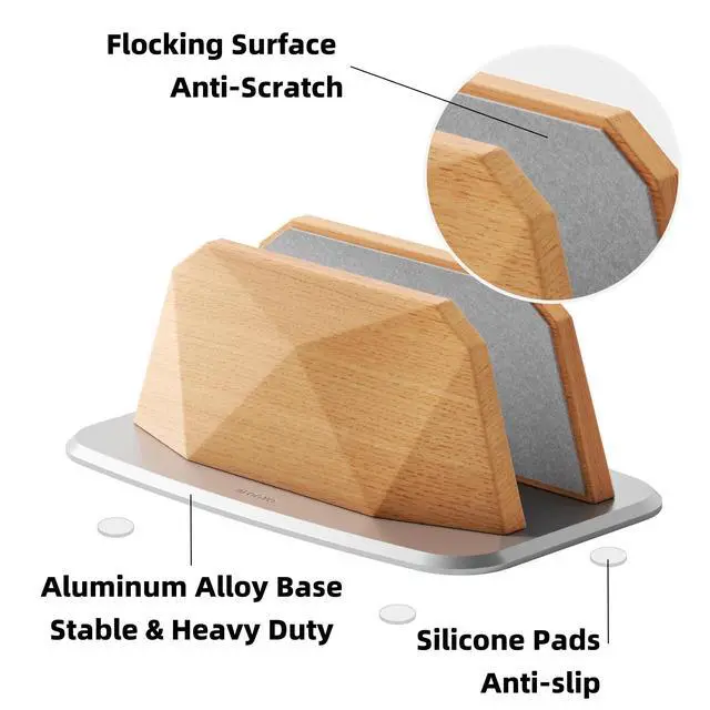 Protection and Stability: Equipped with a flocking cushion and non-slip silicone spots, the stand protects your laptop from scratches and prevents it from sliding or shifting. The combination of these materials ensures that your device stays securely in place while avoiding damage to both the laptop and the stand. ^^ Stable and DurableCrafted from high-quality wood side panels and sturdy aluminum alloy base, this laptop stand is designed for long-term stability and durability. The precision-engineered connections between the base and wooden legs prevent loosening and ensure stability. The stand's design also prevents slipping, keeping your device securely in place. Whether in a busy office environment or at home, this stand provides reliable support for your laptop. ^^ Easy to InstallInstalling this laptop stand is straightforward and quick. Simply follow the instructions to tighten the screws on the base and wooden legs, and adjust the movable slots. No complex tools or cumbersome steps are required, making assembly easy and efficient. This simple installation process saves you time and hassle, allowing you to focus on enhancing your productivity.