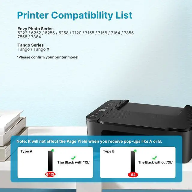 Package Includes: 64xl black and color combo pack xl (1 x 64xl black ink cartridge, 1 x 64xl color ink cartridge), 1 x User Guide ^^ 64XL Black and Color Ink Cartridge for HP printers to Use with HP ENVY Inspire 7955e 7958e ^^ Compatible with Tango/HP Tango X Photo 6255 7155 7858 7155 7855 6222 6252 6258 7120 7158 7164 7855 7858 7864; HP Envy Photo 6220 7230 7272 7275 7975 7978 Printer ^^