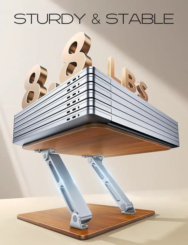 Ergonomic DesignSay goodbye to poor posturethe laptop stand offers a height adjustment range of 1.88" to 11.88" ( 4.6 cm-31cm), allowing easy switching between sitting and standing positions. Its ergonomic design helps you maintain proper posture, whether you're working, studying, or streaming your favorite content, reducing strain on your neck and back. ^^ Elegant Wood AestheticFeaturing royal teak-inspired grain on a warp-resistant composite wood panel that resists fingerprints and stains, this wooden laptop stand for desk combines elegance with practicality. Its matte warm tones bring a calming and modern aesthetic to any workspace.
