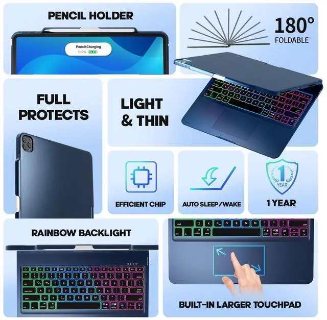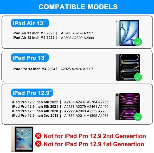 Compatibilityipad Pro 13 inch case with keyboard compatible with New iPad Pro 13-inch (M5); iPad Pro 13 inch M4 2024(A2925, A2926, A3007); iPad Air 13 inch M2 2024(A2898, A2899, A2900); iPad Pro 6th generation 12.9 inch 2022 (A2436, A2437, A2764, A2766); iPad Pro 5th generation 12.9 inch 2021 (A2378, A2379, A2461, A2462); iPad Pro 4th Generation 12.9 inch 2020 (A2229, A2069, A2232, A2233); iPad Pro 3rd Generation 12.9 inch 2018 (A1876, A2014, A1895, A1983). ^^ Built-in Touchpadipad air 13 inch case keyboard comes with a 4.3 -inch built-in touchpad, so you can easily browse websites, edit documents, and participate in meetings without a mouse when using the ipad air 13 inch keyboard.