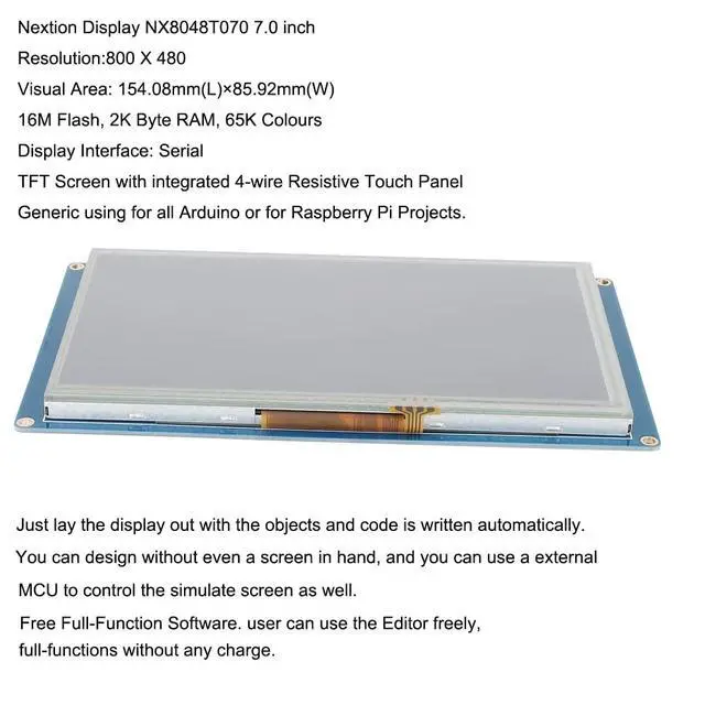 NX2432T070 is a powerful 7.0 '' HMI, a 7.0" TFT 800480 resistive touch screen display, 16M Flash, 3584 Byte RAM, 65k colors. It's easy to adapt Nextion family HMI to existing projects, you just need to provide it a UART. Uploading TFT file via sd card is faster than 4pin serial port, but pls check card is FAT32 format and no more than 32GB. ^^ Nextion is a Seamless Human Machine Interface (HMI) solution that provides a control and visualisation interface between a human and a process, machine, application or appliance.