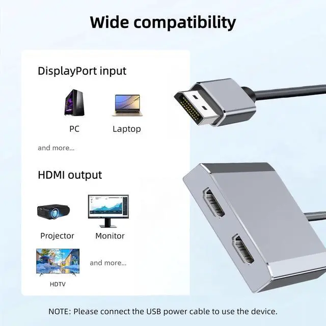 4K@60Hz Ultra HD Visual FeastThe DisplayPort to HDMI Splitter 1 in 2 out extended display complies with the HDMI 2.0 standard, HDMI displays support resolutions up to 4K@60Hz, for vivid images with even more amazing picture color and contrast. To transmit 4K60Hz video signals, please make sure all your devices and cables support 4K60Hz. Note: Some computers need to manually set the display settings interface to 4K60Hz resolution and set it to extended or mirrored mode. Please ensure that your HD