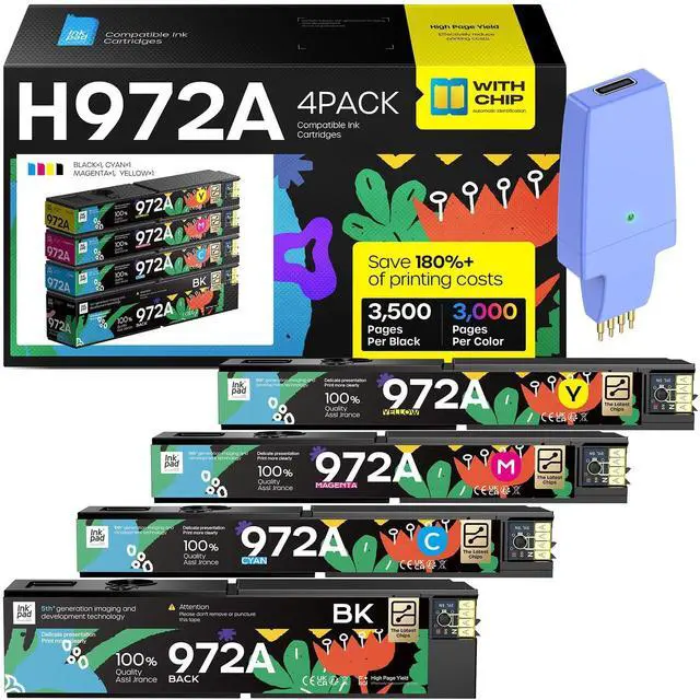 ^^ High-Yield Performance: Enjoy exceptional page yield with up to 3, 500 pages per 972A Black cartridge and 3, 000 pages per 972A color cartridge (Cyan, Magenta, Yellow). Maximize your productivity with these high-yield ink cartridges that deliver outstanding results.