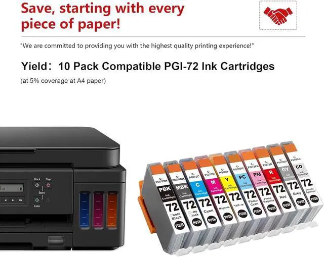 Number of sheets printed: PGI-72 Black Ink up to 1200 Pages, each bottle is compatible with PGI-72 color ink up to 7700 Pages. (At 5% coverage on A4 paper) Choosing our PGI-72 can greatly save time to replace the ink ^^