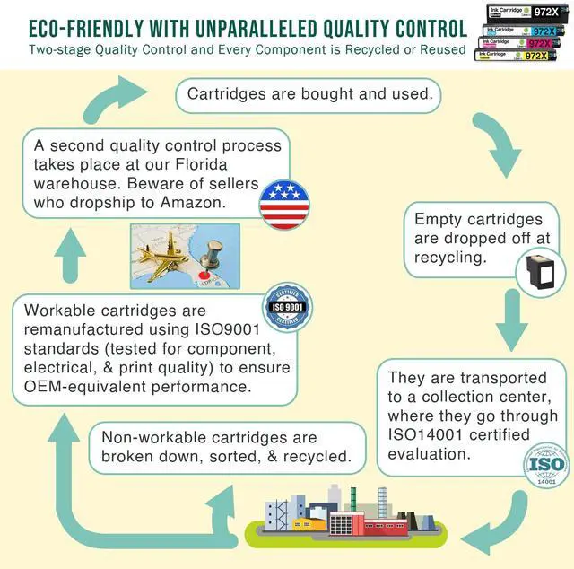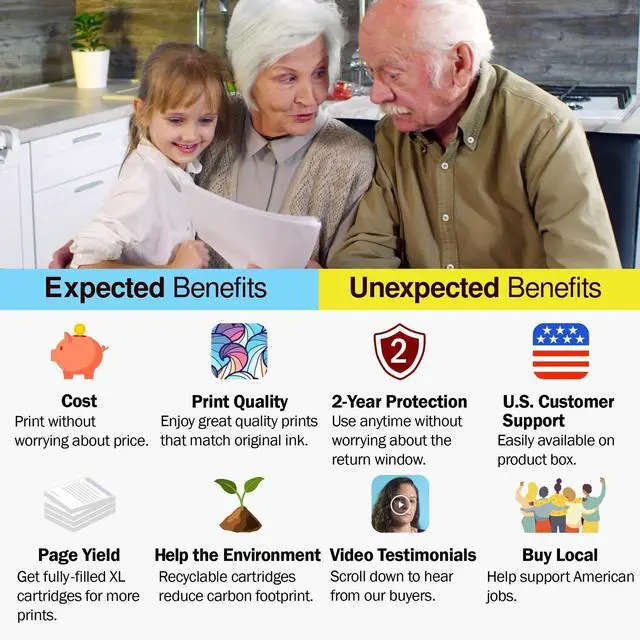 GET RELIABLE, QUALITY PRINTS AS GOOD AS ORIGINAL INK. Get your ink from a US-based, accountable company that can be reached easily. Our compatible ink cartridges are tested to ensure consistent, quality prints that match the image/text seen on one's printer both at the component level and with print tests. All cartridges are tested both at manufacturing, and again at our FL warehouse. This is done to ensure our ink perfectly matches your printing needs- with vivid colors and sharp text. ^^ 1-YEAR WARRANTY AND U. S. -BASED PHONE AND EMAIL SUPPORT.