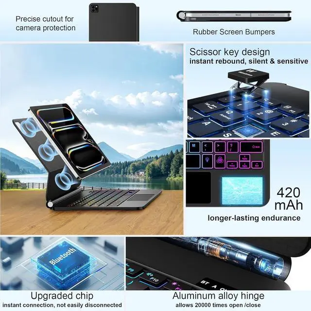 NOTE: NOT FIT FOR IPAD AIR 13(M3 2025 /M2 2024), Were happy to help! Reach out to us if you need to check compatibility ^^ 7-Color Backlit Keyboard Case for iPad Pro 13 M4From dawn to dusk, adapt effortlessly! Adjusting 7 backlight and 3 levels of brightness ensures clear visuals in every setting, enhancing your immersive experience. ^^ Floating Cantilever Stand & Multi-View Flexibility: The magic-style floating cantilever stand and strong magnetic attraction hold iPad firmly and stably in place like a laptop, the floating cantilever design allows you to easily adjust to your favorite viewing angle for typing or browsing. ^^ Multi-Touch Clickable Trackpad Keyboard for iPad Pro 13