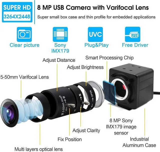 Ultra HD 8MP High Resolution- Focus adjustable 5-50mm lens 8MP usb camera provide vivid, high-definition 2448p video, capturing the most exciting details at every 30/15fps, providing incredible HD capture of clear images. MJPEG/YUY2 picture format, fast transmission, HD lens and high quality, means that your recorded video is clear, vivid and colorful. ^^ High Quality IMX179 Image Sensor- 8 megapixel webcam with IMX179 Sensor is the high standard in terms of image quality and sensitivity performance. 5-50mm varifocal lens usb camera with IR-cut filter@650nm for true color day images/videos (Does not work with 850nm IR illumination), focus adjustable.
