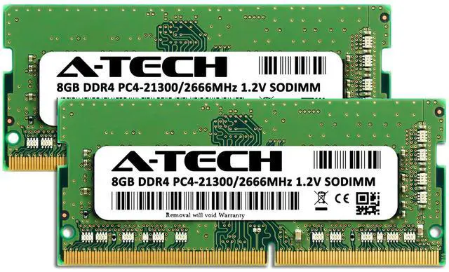 A-Tech Memory (RAM) upgrade compatible for select Laptop, Notebook, and All-in-One (AIO) computers ^^ 16 GB RAM Kit (2 x 8GB Modules); DDR4 SO-DIMM 260-Pin; Speeds up to 2666/2667-MHz, PC4-21300 (PC4-2666V) ^^ NON-ECC Unbuffered; 1Rx8 or 2Rx8 (Single or Dual Rank); JEDEC DDR4 standard 1.2V ^^ Expands your system's available Memory RAM resource, improving performance, speed and allowing you to take on more while maintaining a smooth experience ^^ Quick and easy to install, no expertise required (Please refer to your system's manual for seating and channel guidelines) ^^ All A-Tech memory modules undergo stringent quality control testing to ensure dependable and reliable performance ^^ Backed by A-Tech's Limited Lifetime Warranty and supported by our knowledgeable Tech Team available to help before and after your purchase