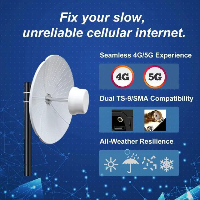 Introducing the HzFitInc 2x2 MIMO Antenna, engineered to deliver superior connectivity with a high gain performance of 34dBi. This versatile antenna supports a broad frequency range from 600MHz to 6000MHz, ensuring compatibility with 5G, 4G, LTE, and WiFi networks across major carriers such as Verizon, AT&T, Sprint, and T-Mobile. Featuring advanced MIMO technology, it enhances data speeds and connection reliability, making it ideal for home internet solutions and critical applications. Designed for long-lasting outdoor use, the complete kit includes a directional parabolic antenna, two 49 ft SMA cables, two TS9 cables, and two N Male Adaptersproviding an all-in-one solution for exceptional network performance.