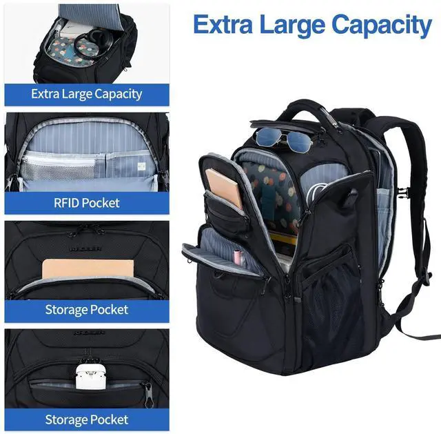MULTI-COMPARTMENT: Our large travel backpack with separated compartments and pockets which can provide roomy space for your computer, iPad, power bank, A4 files, wallet, cards, clothes and more your items. Functional front pocket with waterproof zipper. Side zippered pockets and mesh pockets can hold your umbrella, water bottle, small accessories etc. A hard shell zone is designed on the top which is convenient and safe for you to put your sunglass, cell phone etc ^^