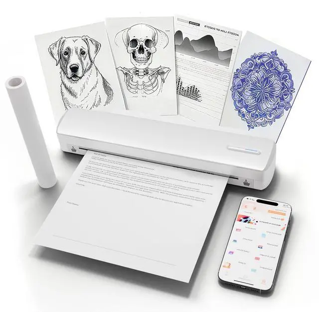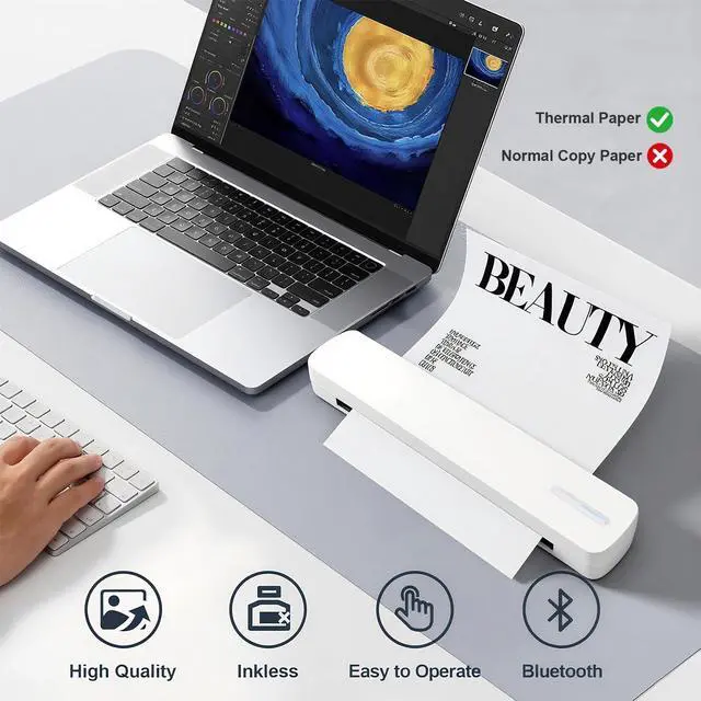 Note: This printer is compatible exclusively with thermal paper (not suitable for standard copy paper) and supports black-and-white printing only. ^^ Portable Printers Wireless for Travel -Weights only 530g with portable size, and 1500mAH large battery, ideal for travel, capable of pinting 400 sheets st once when fully charged. ^^ High Compatibility Phone Printers - This portable printer works seamlessly with laptops (macOS & Windows via USB) and smartphones (iOS & Android via Bluetooth). ^^ Multi-Size Printing Capability - This wireless portable thermal printer comes with a built-in paper bin, supporting thermal roll paper, as well as continuous and single-sheet thermal paper. The compact wireless printer also accommodates 5 thermal paper sizes: 8.5" x 11" (US Letter), A4, and A4 Tatoo Papermeeting most of your printing needs. ^^ Ideal gift - Whether for birthdays, holidays, or as a thoughtful gesture, the C80 delivers convenience and reliability, making it a gift thats sure to be appreciated daily. deal for students juggling assignments on campus, frequent travelers needing on-the-spot document prints, or busy professionals managing tasks on the go, this compact device fits seamlessly into any lifestyle. ^^ What's in the