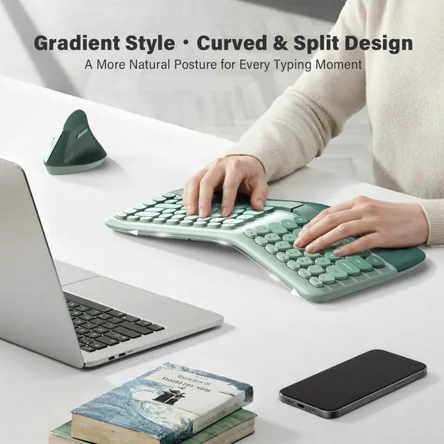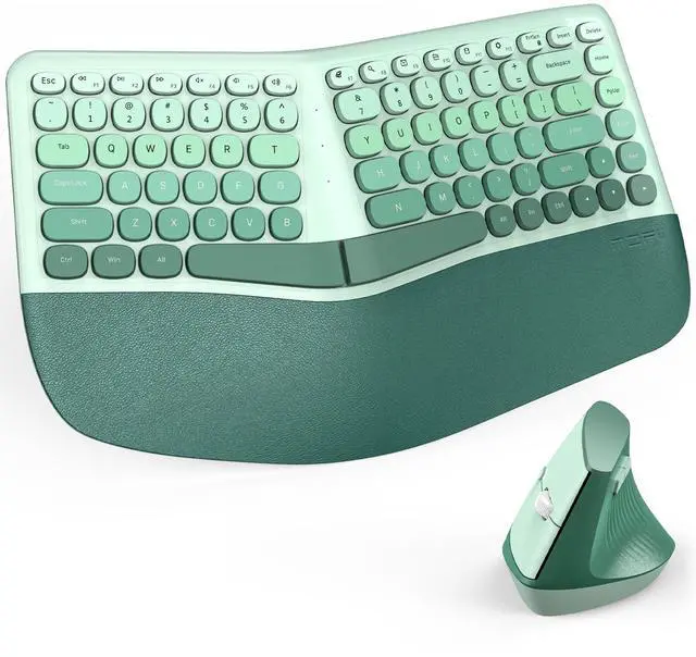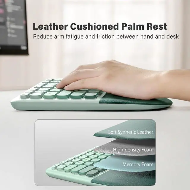 Wrist-Friendly Typing, No Fatigue Even After Long Hours- The curved split keycaps reduce pressure on your fingertips, relieving muscle tension in wrists and forearms. Paired with the curved padded palm rest, it provides natural support the moment your hands rest on the keyboard, targeting strain at the source. The palm rests leather-like surface is stain-resistant, easy to wipe clean, and smooth to the touchdurable for daily use.