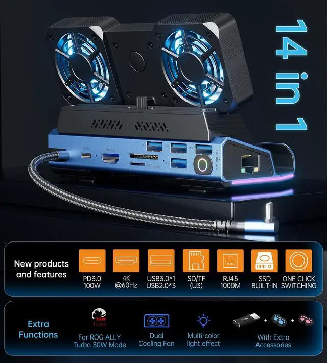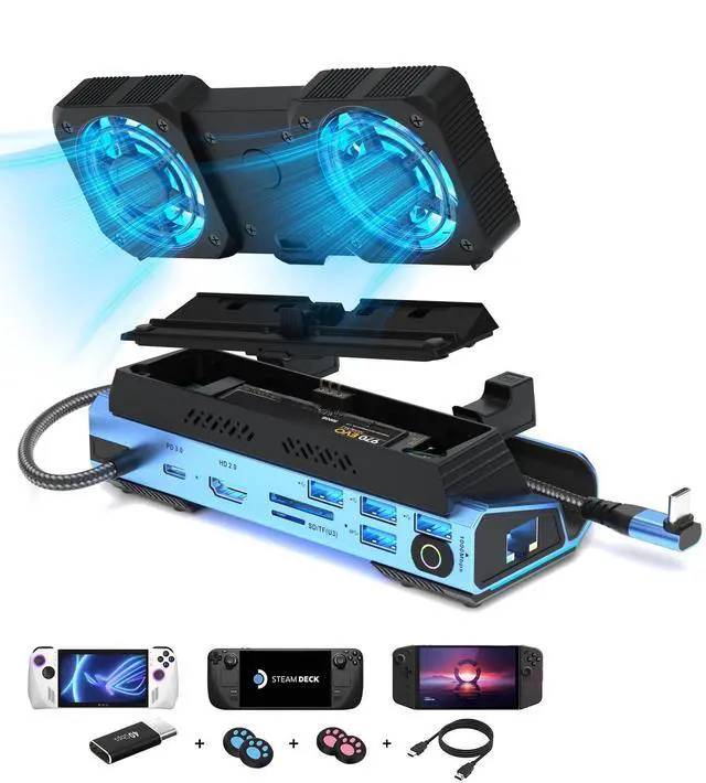 Handheld Console Dock: Transforms your Steam Deck OLED/ASUS ROG ALLY/Legion Go's USB Type-C into 9 ports: M. 2 NVMe expansion slot, HDMI 2.0 (4K@60Hz), Gigabit Ethernet (1000Mbps), 1 USB 3.0 (5Gbps), 3 USB 2.0, USB Type C PD 3.0 (100W), SD/TF reader, 1 Key to change Screen, this handheld console dock combines hub, stand base, heat sink, 40Gbps Type C adapter, 4 Cpas, 1 HDMI cord in 1.5M, it is a professional handheld gaming dock station. ^^ Removable & 3 speed Adjustable Cooling