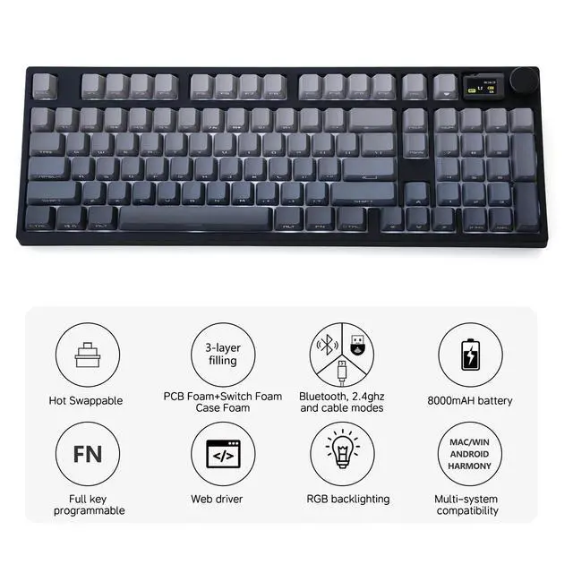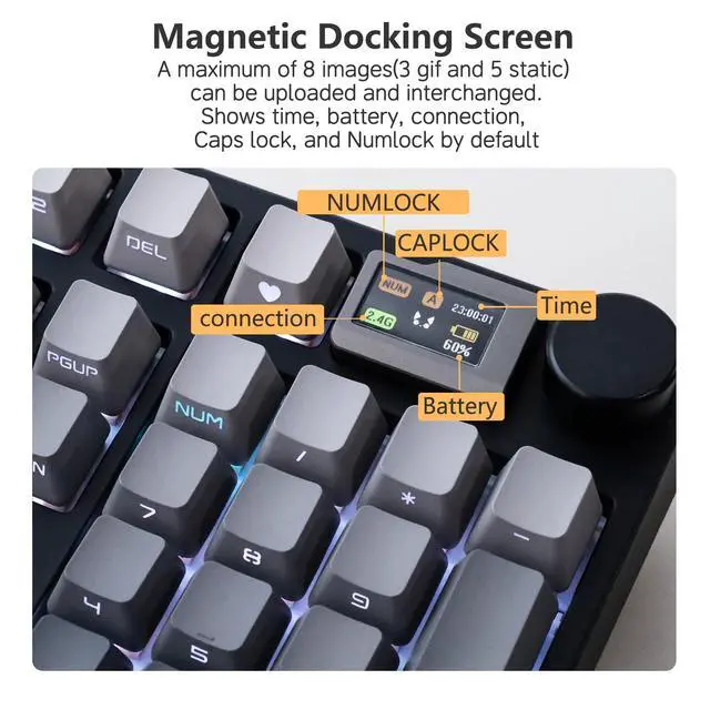 [Customizable Screen] Cutomize the little screen with your favorite images, adding a little enjoyment to relax your mind amidst the heavy workload. A maximum of 8 images (3 gif and 5 static) can be uploaded and interchanged. Shows time, battery, connection, Caps lock and Numlock by default ^^ [Handy Calculator] Conveniently and swiftly perform a quick calculation on the screen. Streamline your workflow by instantly calculating on-screen, eliminating the necessity of searching for a calculator or utilizing the computer's calculator. ^^ [Hot Swappable PCB] Enables convenient switch swapping to customize typing feel without the need for soldering.