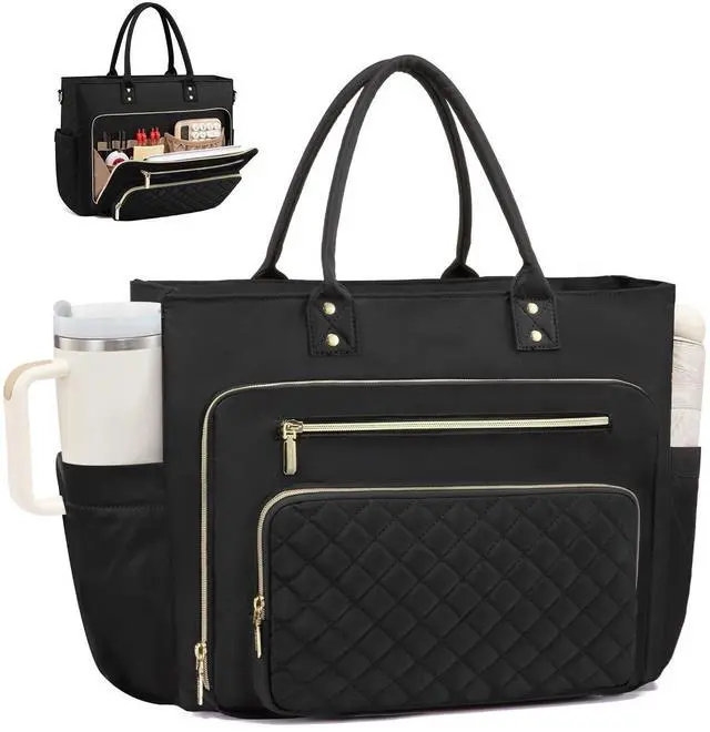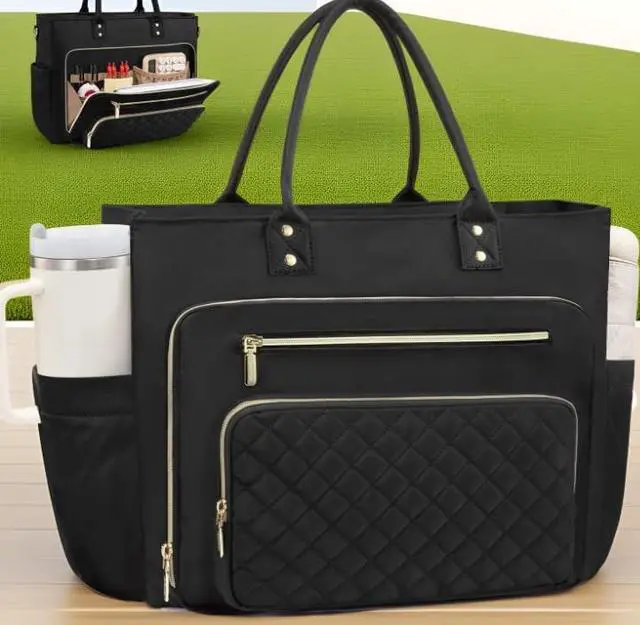 This versatile work tote for women features three spacious front zipper pockets and multiple small slots, keeping daily essentials systematically organized. Ideal for teachers storing pens, rulers, and sticky notes; nurses carrying stethoscopes and thermometers; or onthego moms managing toys, bottles, and diapers with ease. ^^ Designed for your oversize water bottle, this laptop tote features an elastic side pocket that holds containers up to 40oz. The innovative structure secures bottle handles perfectly, ensuring steadiness and easy reach. Ideal for professionals and travelers on the move, this practical pocket combines everyday function with modern style.
