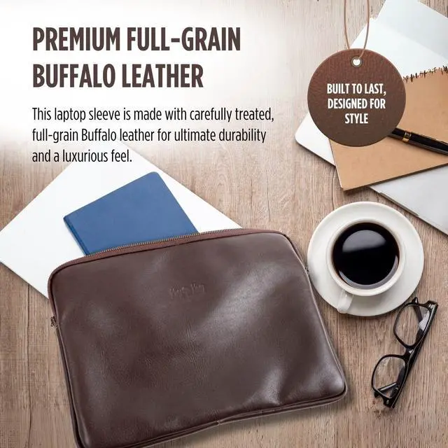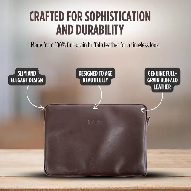 Premium Full-Grain Buffalo Leather Laptop Sleeve: Crafted from genuine full-grain buffalo leather, this leather laptop sleeve combines sophistication and durability. Designed to age beautifully, its the perfect leather laptop pouch for your Mac laptop ^^ 14'' Leather Laptop Sleeve with Soft Padding And